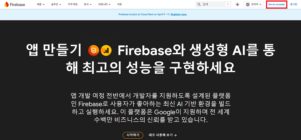 1️⃣ Firebase 홈페이지에 접속하여 Google 계정으로 로그인합니다.
