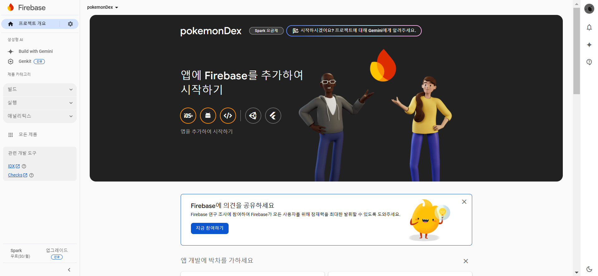 9️⃣ 설정이 완료되면 Firebase 프로젝트 개요 화면이 나타납니다.