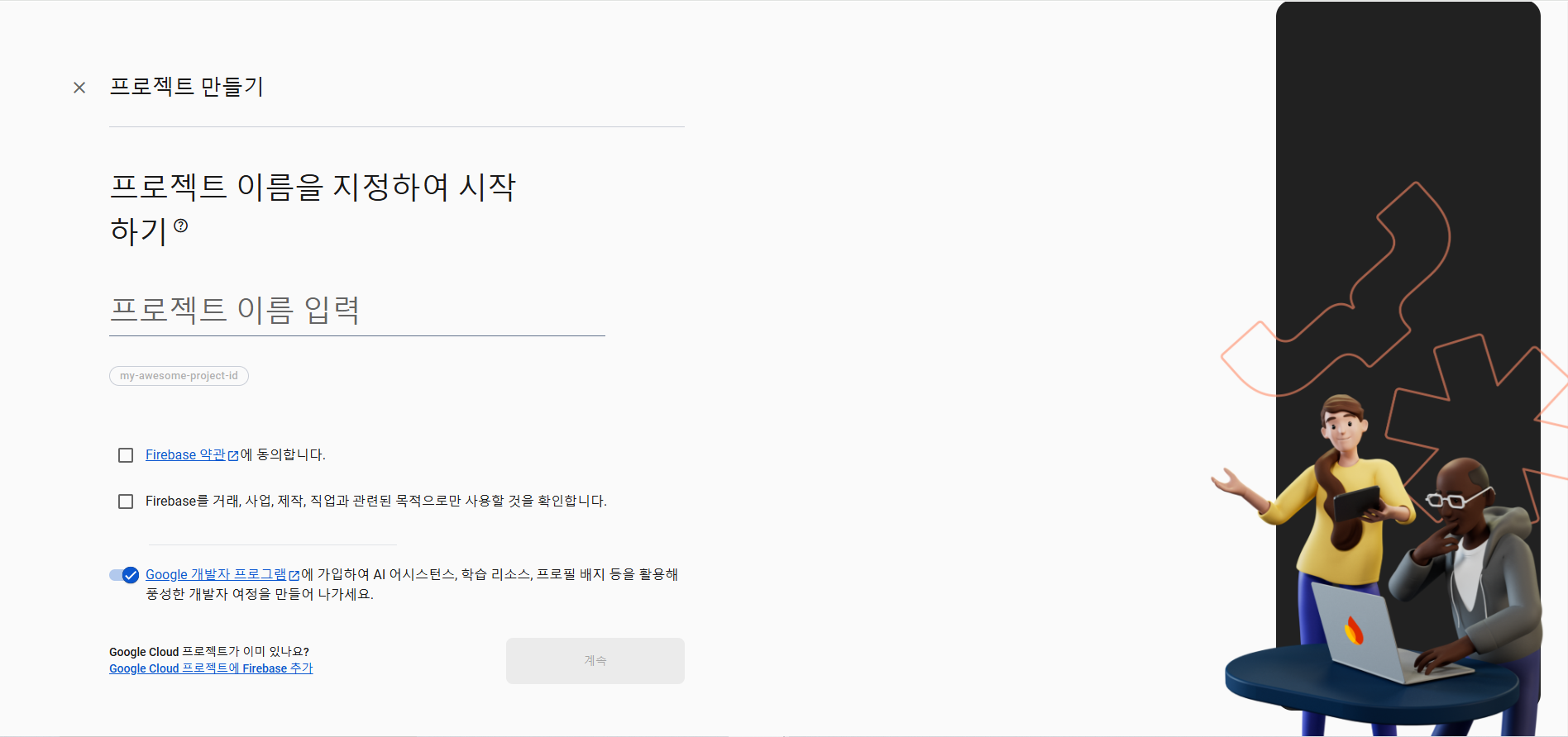 4️⃣ 프로젝트의 이름을 입력한 후 "계속" 버튼을 클릭합니다.