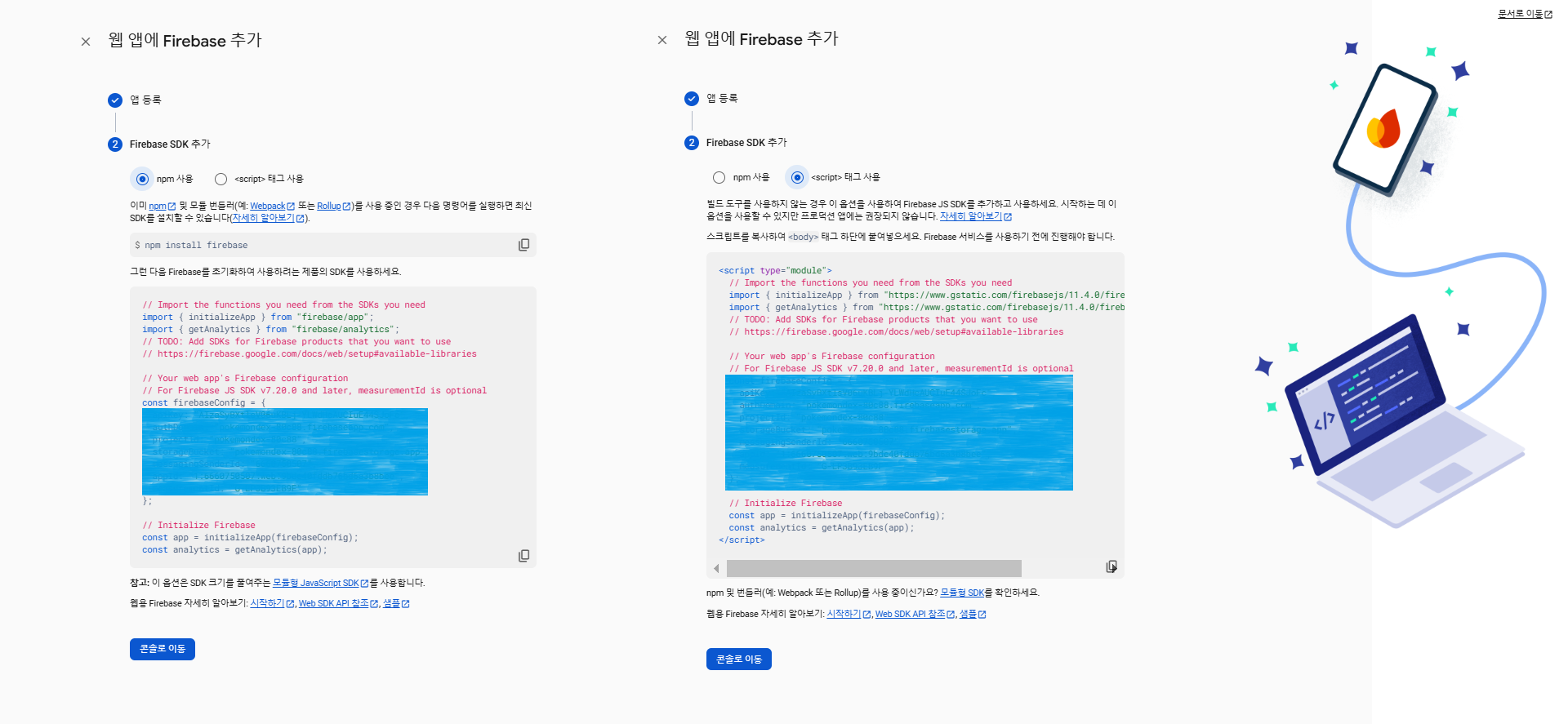 5️⃣ Firebase SDK 확인 및 연동 방법 선택