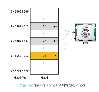 CPU는 10과 20의 메모리 주소를 읽은 후, + 연산을 하여 30 의 값을 도출해내고 그 값을 임의의 메모리 주소에 저장하게 됩니다. 30의 값을 사용할때는 메모리 주소인 0x0669F913에 접근하면 된다