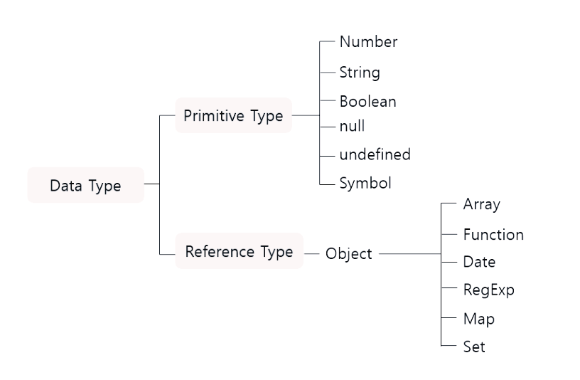 자바스크립트는 7개의 데이터 타입을 제공한다. 7개의 데이터 타입은 원시타입과 객체타입으로 분류할 수 있다.