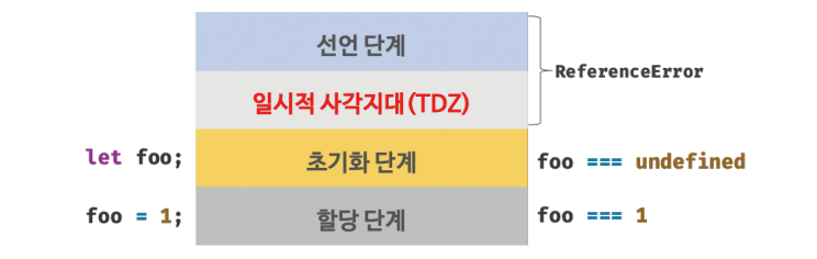 위의 예제에서 호이스팅이 되지 않았다면 foo는 전역변수인 1 값을 출력했었겠지만,let foo = 1; // 전역 변수 { console.log(foo); // ReferenceError let foo = 2; // 지역 변수 }