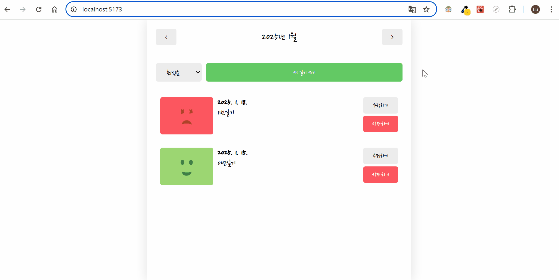 React와 JavaScript를 활용하여 감정 일기장을 제작하였으며, 단순한 일기가 아니라 감정을 함께 기록할 수 있는 특별한 일기장입니다.