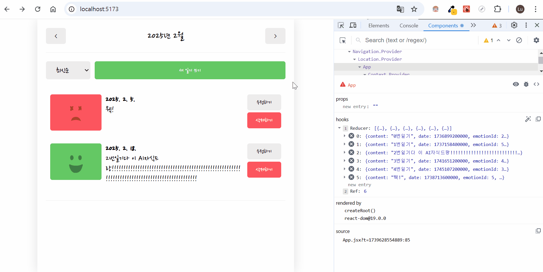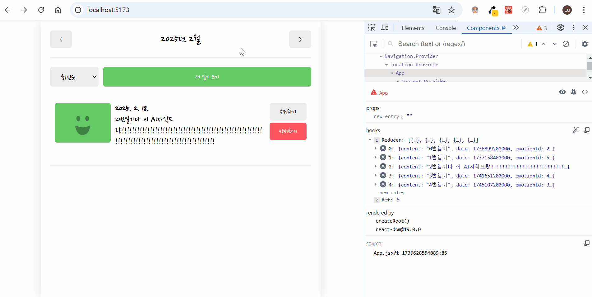 초기에는 상태를 useState로 관리했지만, 일기 데이터가 많아지고 CRUD 기능이 추가되면서 상태 변경 로직이 복잡해지는 문제가 있었습니다.