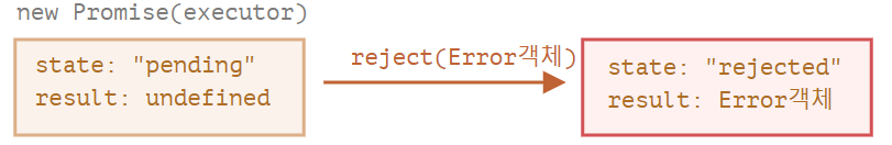 - 1초 후 reject(...)가 호출되면 promise의 상태가 "rejected"로 변합니다.
